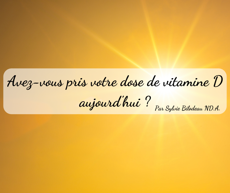 Comme il est très difficile d’obtenir notre dose journalière de vitamine D, un supplément de vitamine D est souvent conseillé. De plus, notre situation géographique ainsi que nos hivers peu ensoleillés ne nous permettent pas d’emmagasiner assez de vitamine D et c’est pourquoi l’ajout de 1000 à 5000 iu de vitamine D sous forme de suppléments par jour est suggéré.