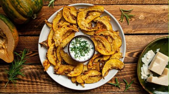 Voilà une délicieuse recette de courge croustillante, simple à réaliser et sans noix ni arachide. Elle sera encore meilleure préparée avec des courges bio, accompagnées de parmesan et de yogourt aux herbes. Ces chips savoureuses peuvent se préparer aussi bien au four conventionnel qu’à la friteuse à air. À vos courges!